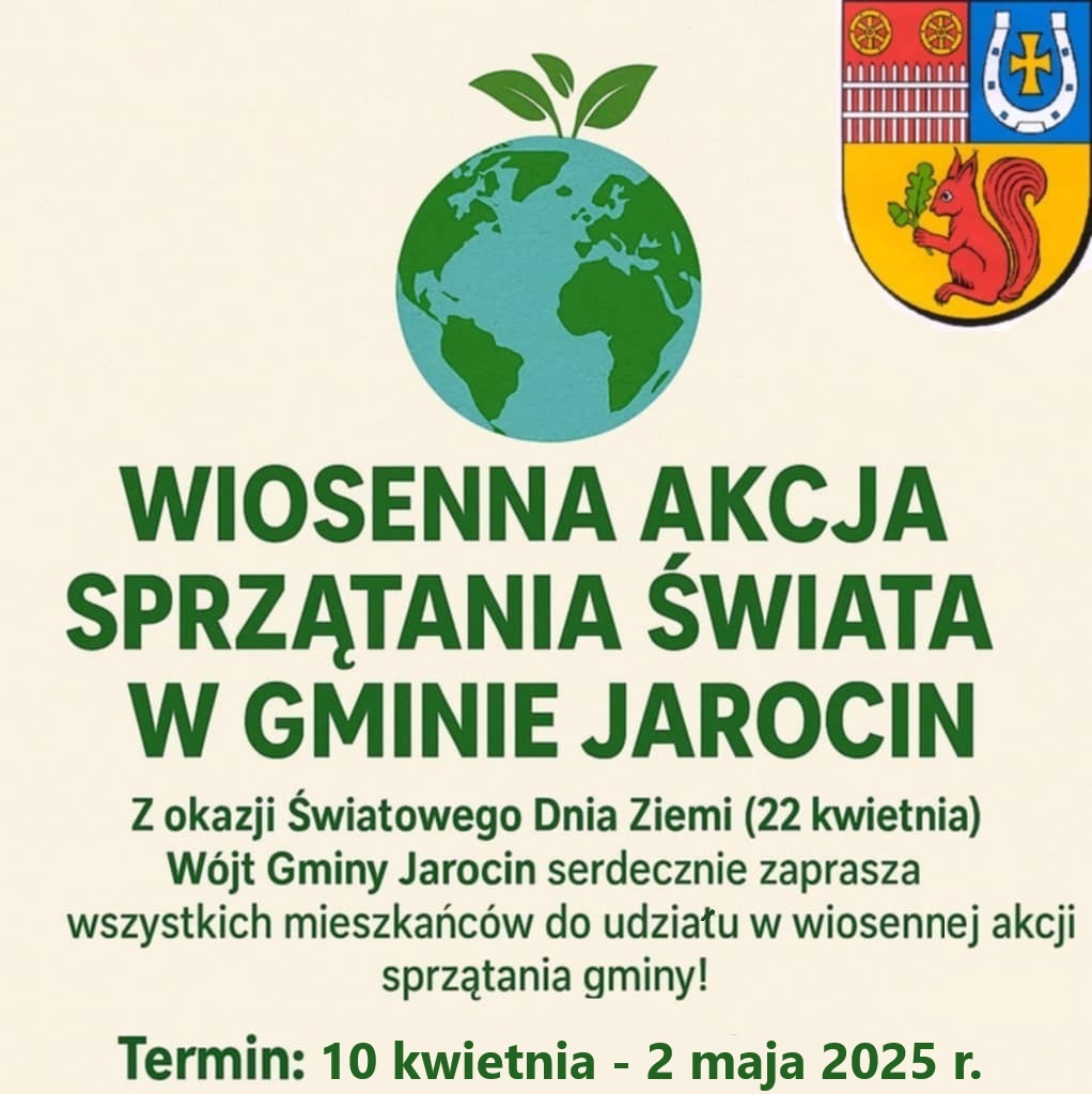 Z okazji Światowego Dnia Ziemi (22 kwietnia) Wójt Gminy Jarocin zaprasza wszystkich mieszkańców do udziału w wiosennej akcji sprzątania gminy! Termin: 10–25 kwietnia 2025 r. Miejsce: Cała gmina Jarocin Zapraszamy do udziału: Szkoły, Koła Gospodyń Wiejskich, Sołtysów i Rady Sołeckie, Stowarzyszenia i wszystkich mieszkańców Organizator zapewnia: Worki na śmieci i rękawiczki Drobny poczęstunek dla uczestników Więcej informacji:15 871 31 41 wew. 28 Dołącz do nas i wspólnie zadbajmy o czyste środowisko!