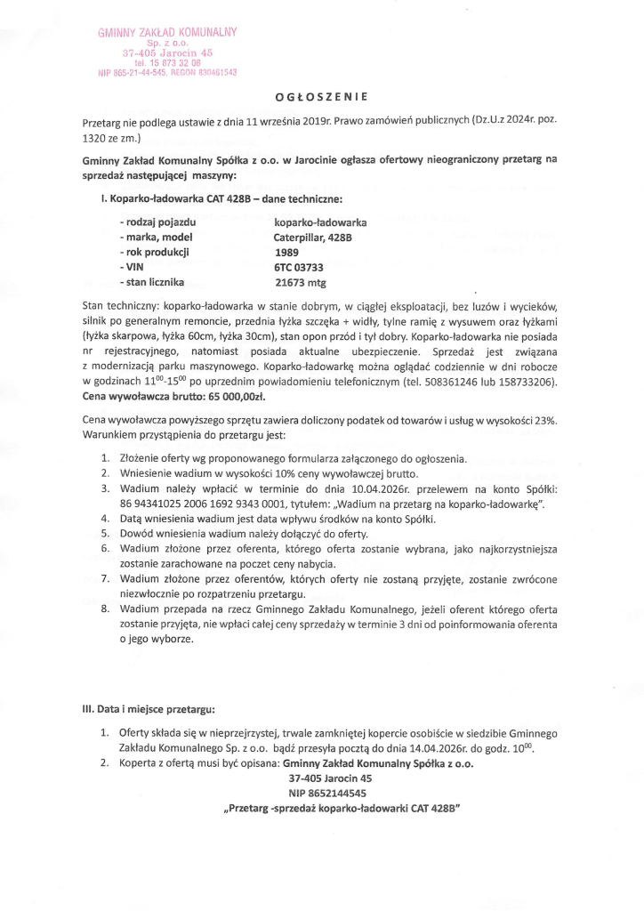 Ogłoszenie sprzedaży koparko-ładowarki Gminny Zakład Komunalny Sp. z o.o. w Jarocinie