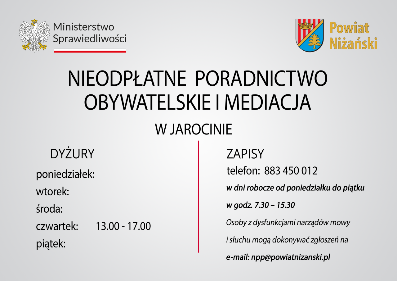 Od dnia 1 stycznia 2026 r. w 3 punktach (wraz z ich filiami) na terenie wszystkich 7 gmin Powiatu Niżańskiego udzielana jest nieodpłatna pomoc prawna i nieodpłatne poradnictwo obywatelskie (w punkcie oraz za pomocą środków porozumiewania się na odległość) oraz mediacja.